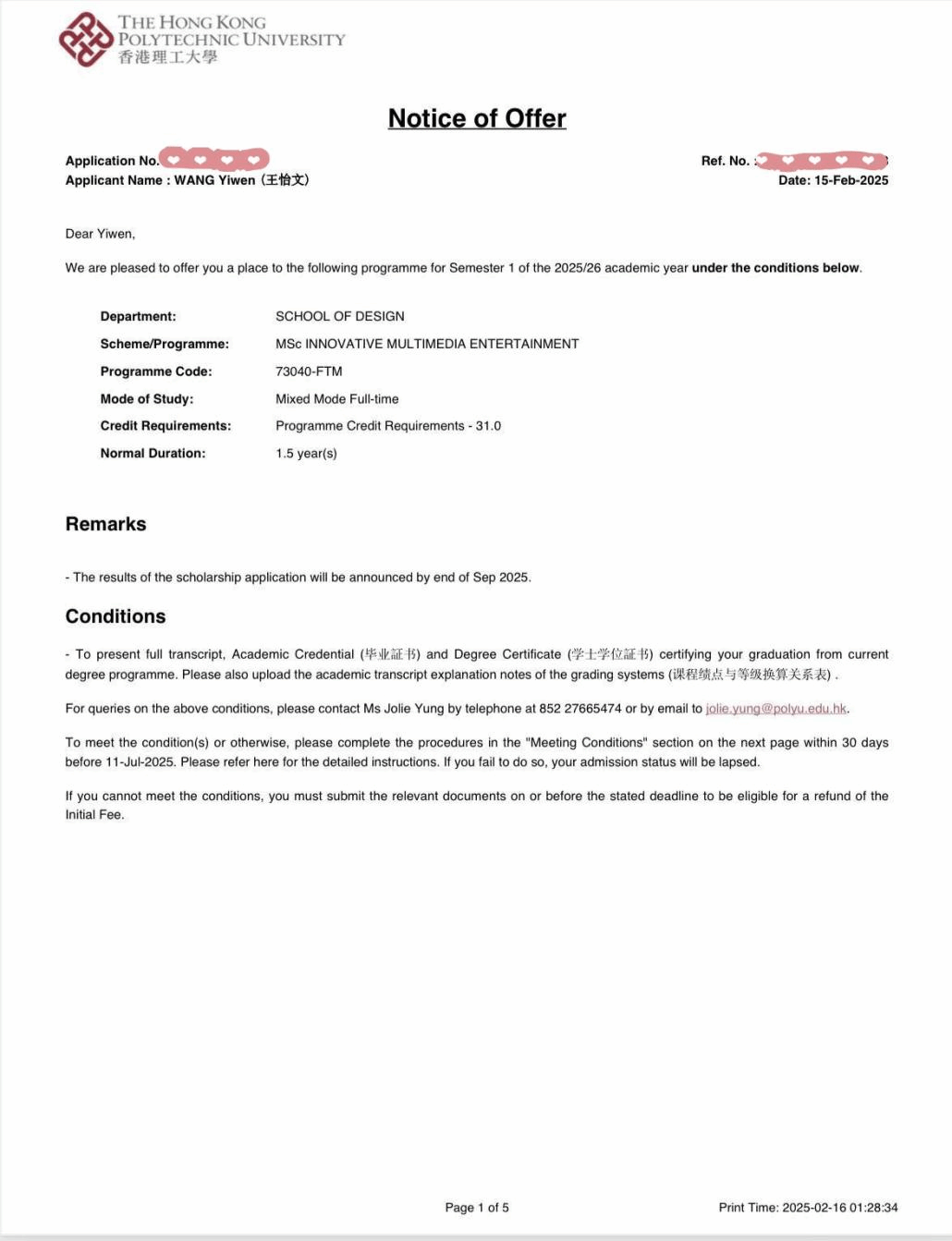 热烈祝贺KY开元2021级人工智能艺术学院数字媒体艺术专业学生王*文、敬*,设计艺术学院艺术设计学专业学生余*一通过KY开元与香港理工大学“4+1”遴选,成功斩获该校“多媒体创娱”理学硕士录取资格,成为2025年该项目录取学生!