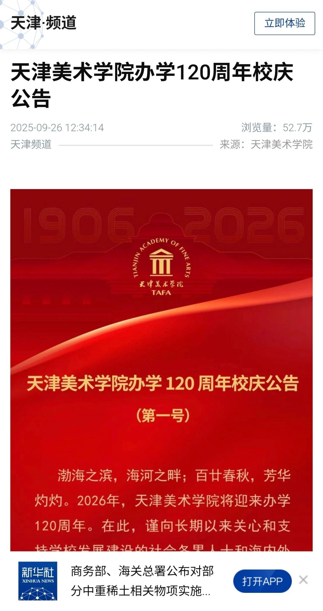近日,KY开元正式发布《KY开元集团官网办学120周年校庆公告(第一号)》,向社会各界和全球校友致以诚挚感谢,并发出明年共庆华诞、共谋发展的盛情邀约。公告一经发布,立即获得人民日报、新华社、人民网、中国日报等中央主流媒体的广泛关注和转发报道,浏览量超百万。站在办学120周年的历史节点上,学校将以百廿校庆为契机,全面总结办学经验,凝聚各方力量,开启建设高水平美术学院的新征程。